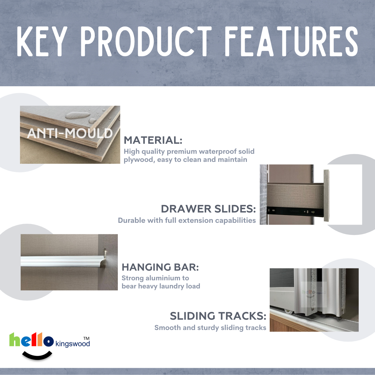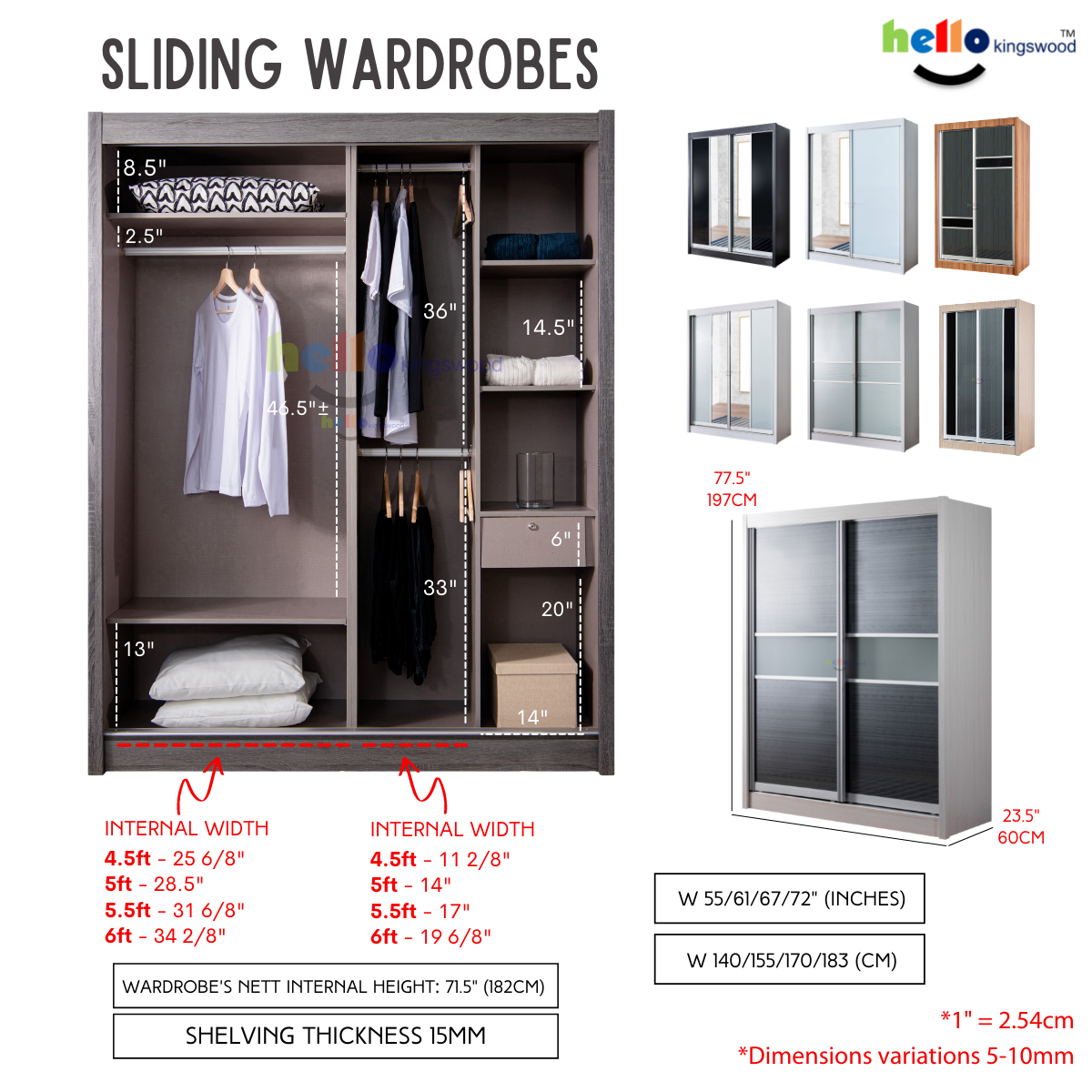 12 months manufacturer warranty included Material: Solid Plywood Sturdy aluminium door frame Strong aluminium hanging bar Durable full extension drawer slides Width: 4, 4.5, 5, 5.5, 6ft Dimensions: H77.5" X D23.5" Frame Colour: Available in 9 trendy colours Scanik Door Design: Metallic Silver (Glass) + Metallic Silver Lines (Glass) Please PM us if you are looking for height 2.4m sliding wardrobes.