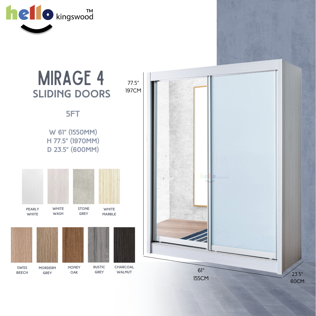 [Kingswood] Mirage 4 Sliding Door Wardrobe, 4 | 4.5 | 5 | 5.5 | 6ft, Solid Plywood, 12 Months Warranty Included, Available in 9 Colours
