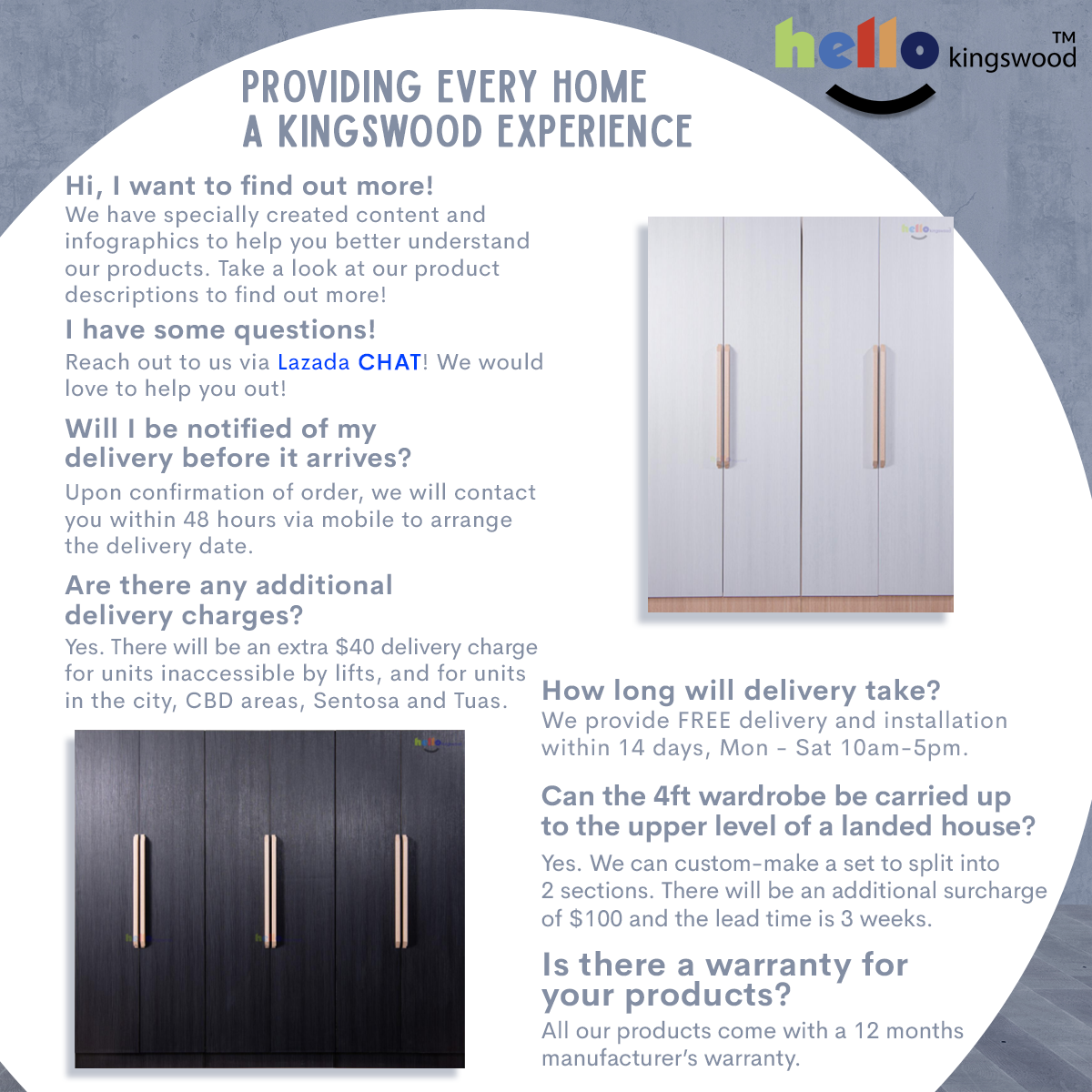 12 months manufacturer warranty included Material: Solid Plywood Sturdy aluminium door frame Strong aluminium hanging bar Durable full extension drawer slides Width: 4, 4.5, 5, 5.5, 6ft Dimensions: H77.5" X D23.5" Frame Colour: Available in 9 trendy colours Mirage 4 Door Design: Full Mirror + Metallic White (Glass) Please PM us if you are looking for height 2.4m sliding wardrobes.