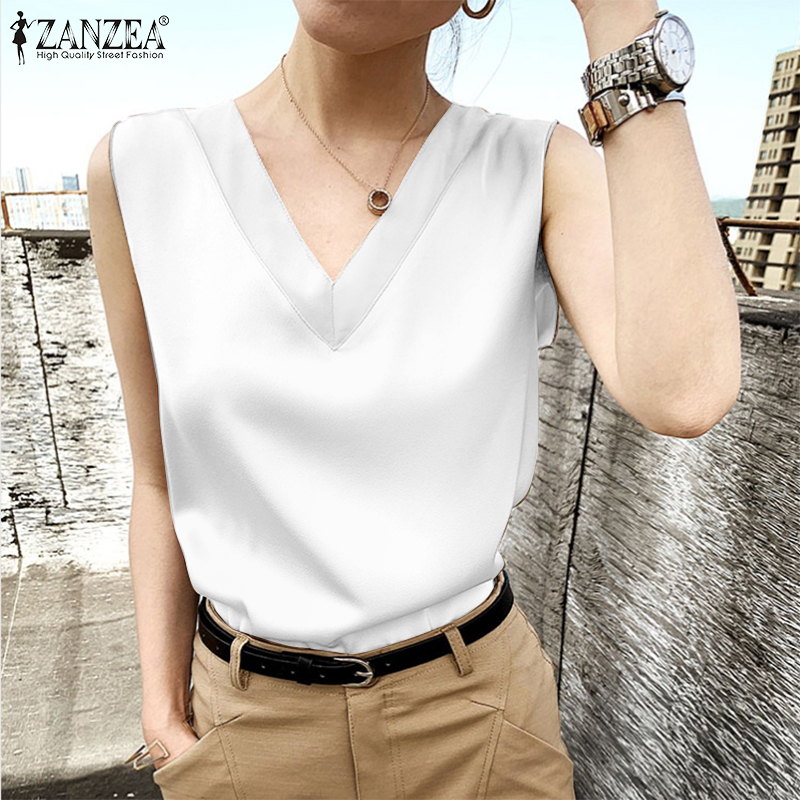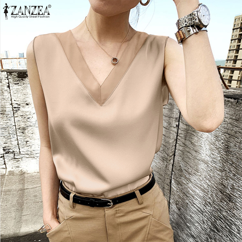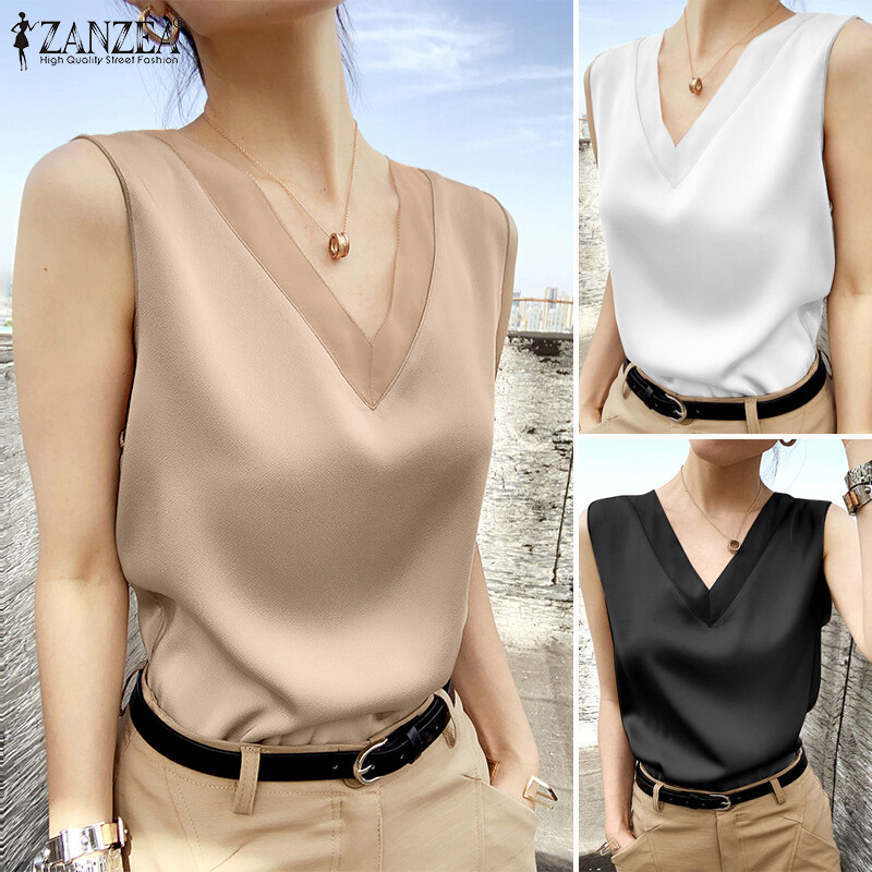 Celmia ZANZEA Women's Sleeveless Satin Silky Tops Blouse Plain OL Office Business Cami Vest #11