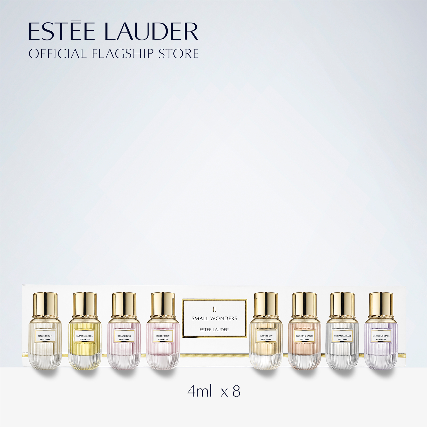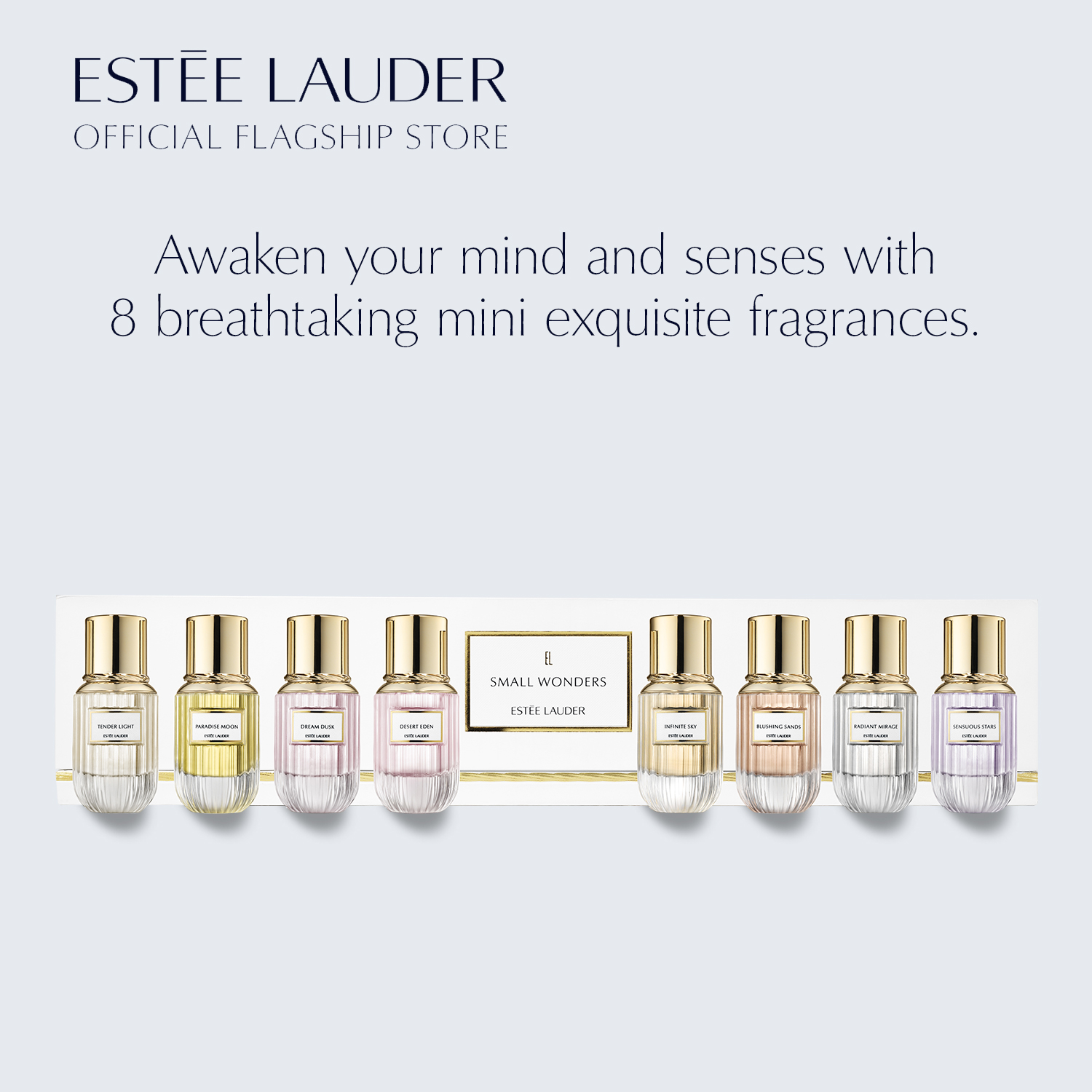 Let your mind imagine them. Let your senses feel them. Discover 8 breathtaking fragrances that capture the beauty of nature and awaken your imagination, to experience undiscovered places fragrance has never taken you before. This exquisite collection includes all 8 fragrances in our Luxury Collection, in Eau de Parfum Deluxe Mini Sprays (4ml each): TENDER LIGHT: Feel the joy and warmth of sunlight and be lifted to a palace of dreams. • Citrus Green: Chinese Tea Accord, Bergamot and Florentine Iris. SENSUOUS STARS: Enjoy the sensual tranquility of a walk under a moonlit sky. • Fruity Chypre: Chinese Plum, Lavender and Orris. DREAM DUSK: Enter a secret garden where flurries of petals lead you from day into night. • Floral Marine: Cherry Blossom, Blackcurrant Buds and Geranium. RADIANT MIRAGE: Follow a timeless road to a new realm of the senses just beyond reach. • White Floral Woody: Jasmine Sambac, Sandalwood and Patchouli. DESERT EDEN: Imagine the moment when the sun’s rays spread over the desert at dawn. • Woody Floral: Sandalwood, Turkish Rose and Olibanum. BLUSHING SANDS: Let your senses lead you in a dream journey across rose-tinted sands. • Woody Vetiver: Vetiver Haiti, Pink Pepper and Musk Accord. PARADISE MOON: Escape to a moonlit forest filled with temptations for the senses. • Leather Floral: Osmanthus, Cistus Oil and Leather Accord. INFINITE SKY: Rise up into a brilliant sunset sky, thrilling your senses with rare beauty. • Amber Spicy: Sichuan Pepper, Madagascar Vanilla and Leatherwood. How To Use Take your mind and your senses on an enchanted journey by spraying onto pulse points, or anywhere you like to wear your fragrance. What it is An exquisite gift set that awakens your mind and your senses with all 8 fragrances in the Estée Lauder Luxury Collection, in Deluxe Mini Sprays.