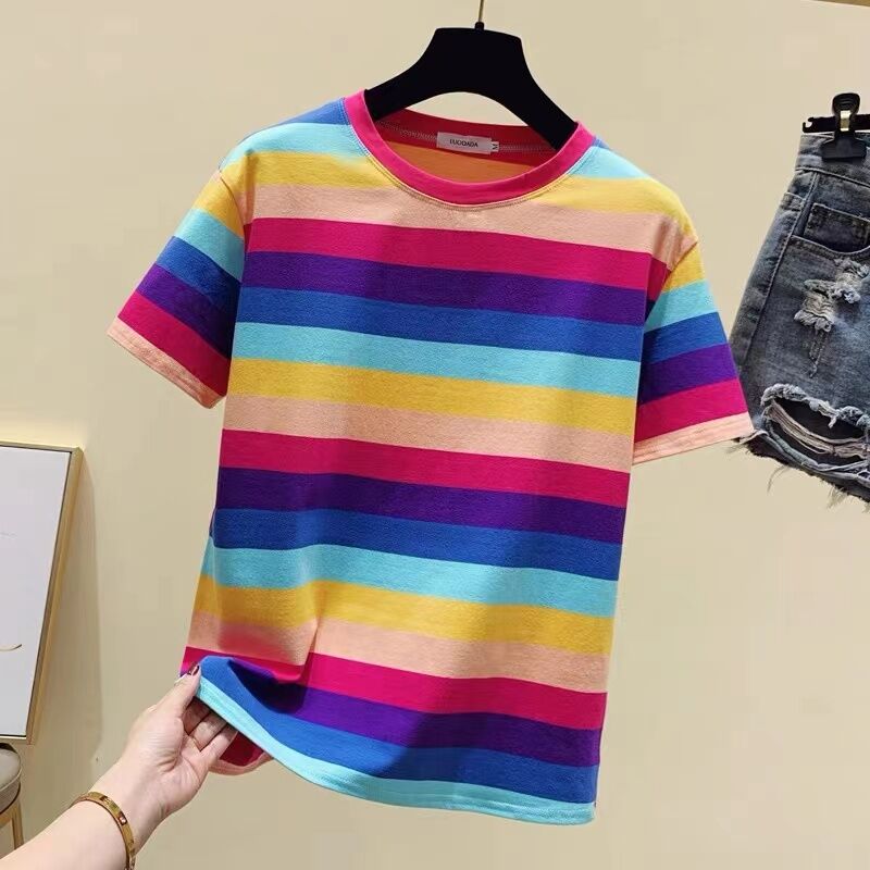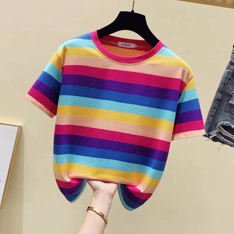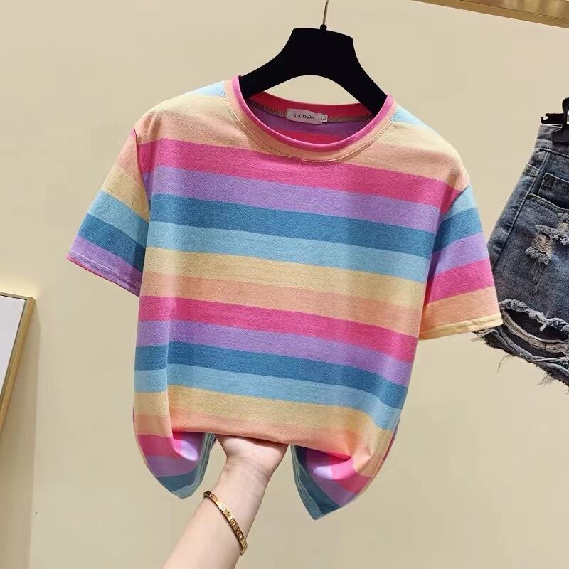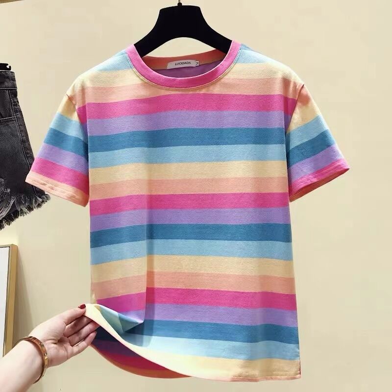 Super Popular Striped Korean Style Loose Round Neck Ins Short Sleeve T-shirt